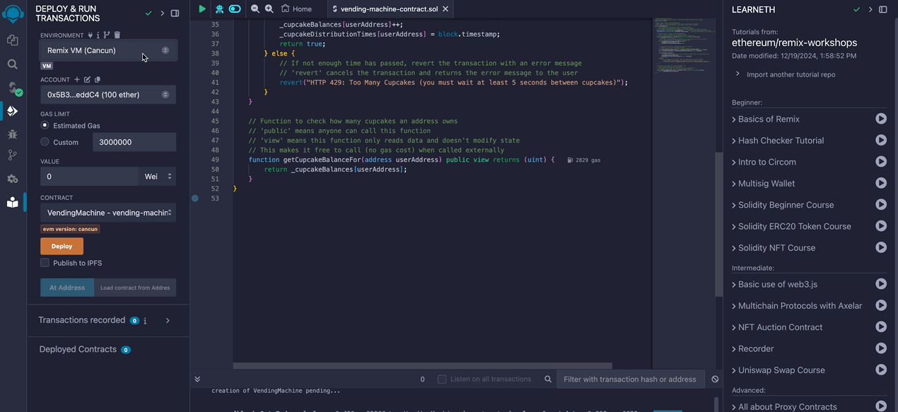 • In Remix, deploy the VendingMachine contract to the Localhost network, then go to the "Deploy & Run Transactions" tab and click "Deploy."